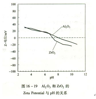 穩定分散體系的形成要依賴于顆粒表面吸附的電荷。經過解離后的顆粒,由于布朗運動,碰撞在一起有可能產生新的團聚,因此要采取適當的措施,阻止顆粒的重新團聚。在實驗中采用了雙電層的辦法阻止顆粒的重新團聚。納米Al2o3和Zro2顆粒有大的比表面積,常常產生鍵的不飽和性,致使納米Al203和Zr02顆粒表面失去電中性而帶電,吸引電解質溶液中帶相反電荷的離子到Al2o3和Zro2顆粒的表面,以平衡其電荷?拷{米顆粒表面的一層吸附緊密,平衡納米顆粒表面的電性,使電位急劇下降;稍遠一些形成的吸附較弱,電位下降緩慢。這樣在整個吸附層中產生電位下降梯度,構成雙電層。納米Al2o3和Zr02粒子在水溶液中的帶電情況與溶液的pH有關,pH不同,其表面可帶正電、負電和呈電中性。當pH較小時,粒子表面形成M-OH2鍵(從代表金屬離子,如Al、Ti、Zr等),導致顆粒表面帶正電;當pH較高時,顆粒表面形成M-0鍵,導致顆粒表面帶負電;當pH處于中間值時,納米顆粒表面形成M-OH鍵,呈電中性;谏鲜鲈,利用Zeta電位儀測出了Al203和Zr02粉末的pH與其顆粒表面帶電情況的關系,如圖下圖所示。